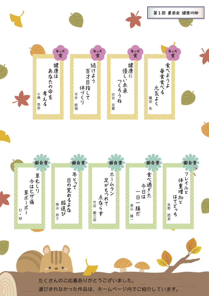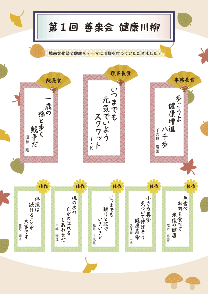 今年は「フレイルチェック」をおこない、同時に「健康川柳」も募集し老若男女多くの方にご応募いただきました。