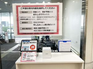 従来は、総合受付カウンター上の番号札をお取りいただきお待ちいただきましたが、今後アプリ導入により自動受付アプリで受付・発券ののち、モニタ上でお待ちの方の人数を可視化できるようになりました。