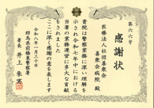 当院は「警察連携に多大な貢献をした」として、管轄である前橋東警察署より感謝状を賜りました。